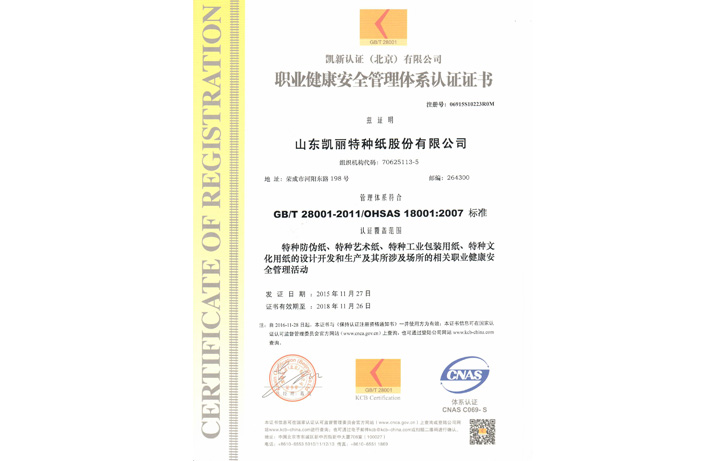 On November 27, 2015, the company passed the certification of occupational health and safety management system