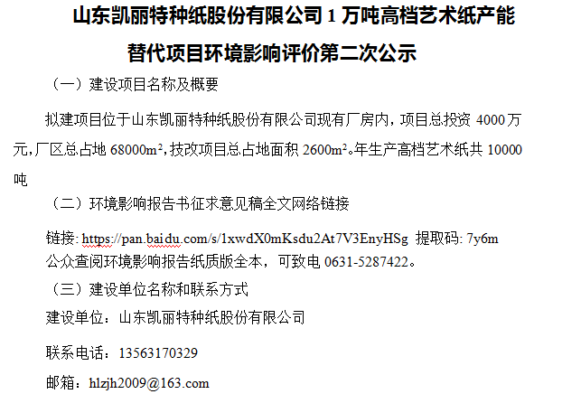 1万吨高档艺术纸产能替代项目环境影响评价第二次公示