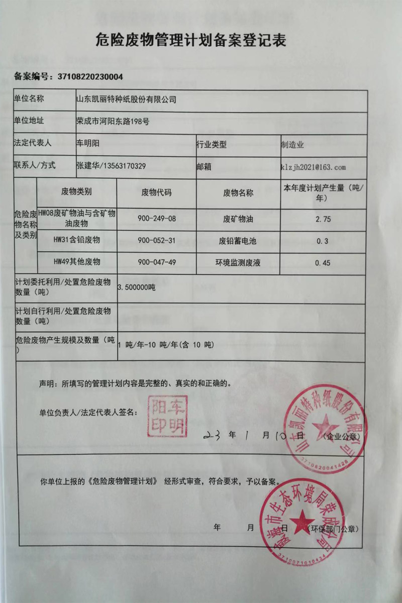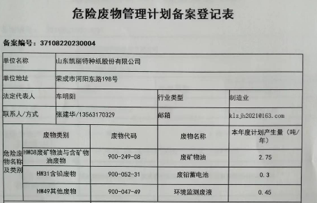 危险废物管理计划备案登记表