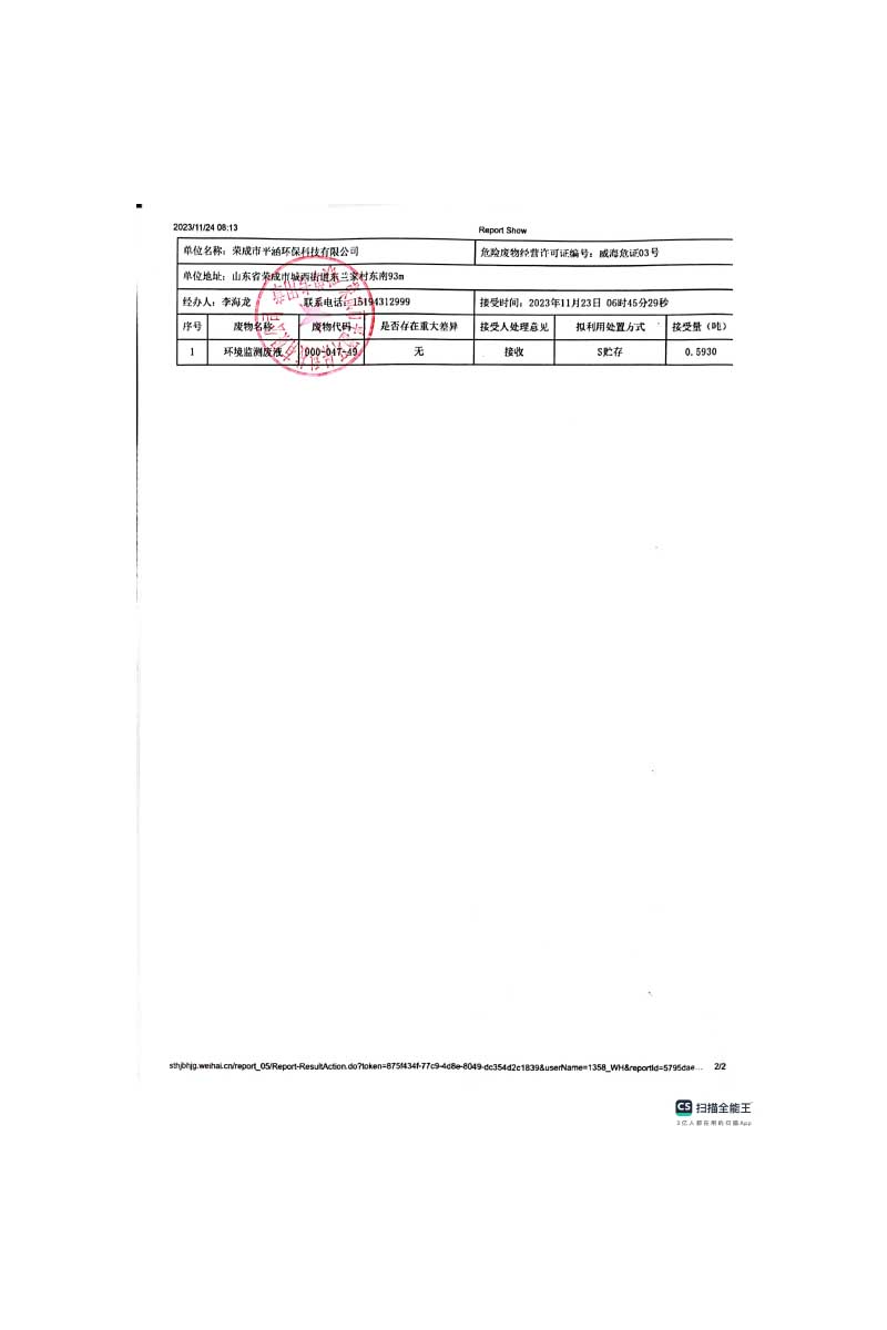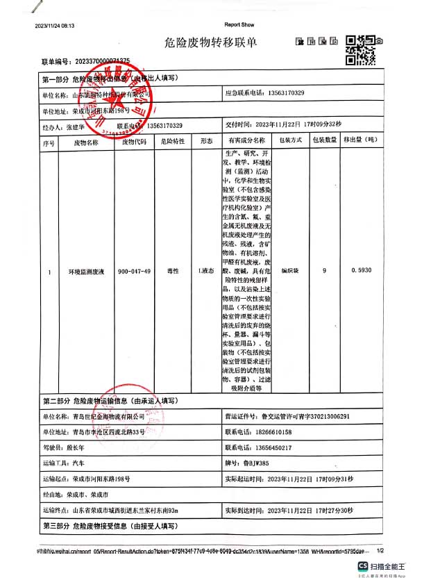 环境监测废液转移联单